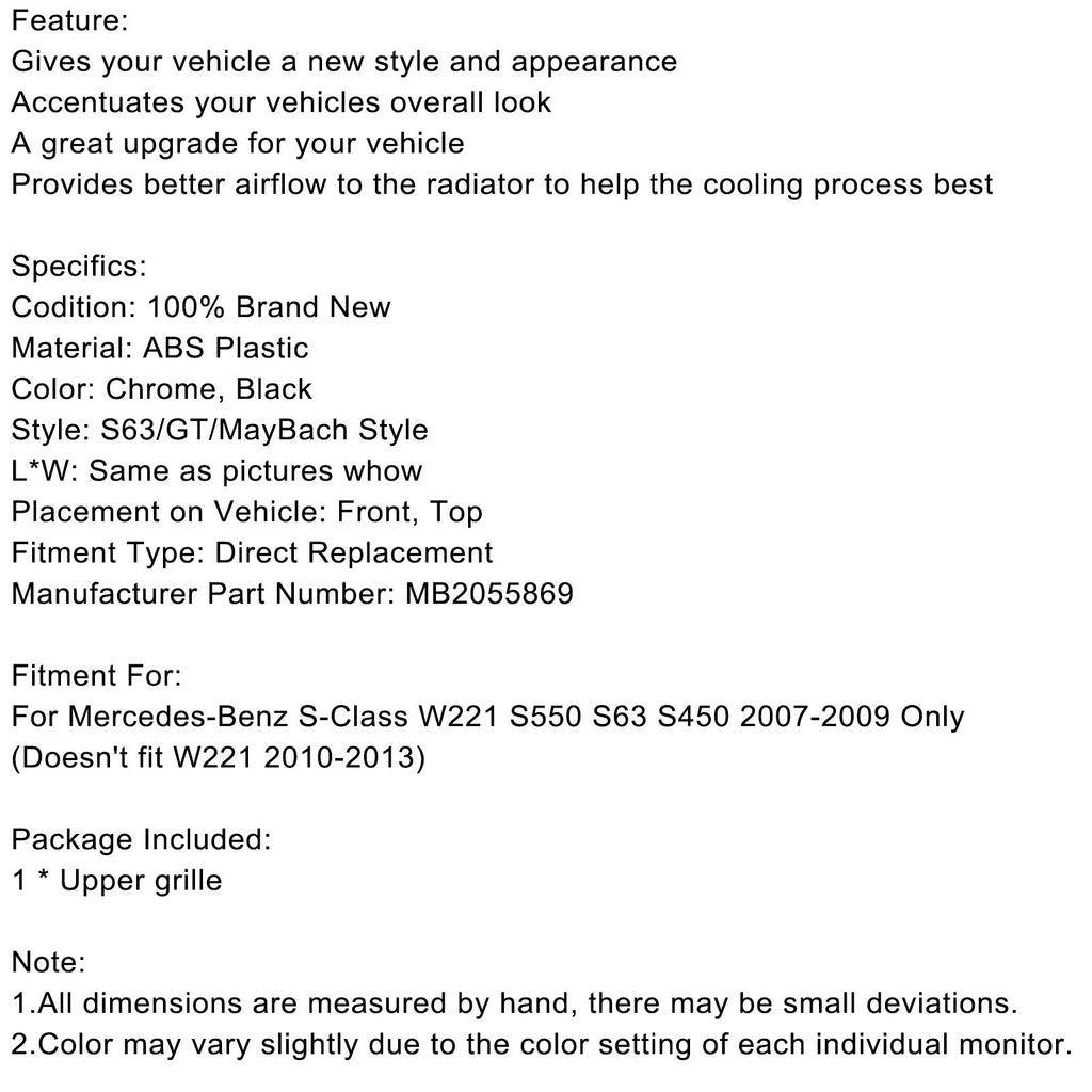 MayBach Stijl Grille Grill Fit Benz S-Klasse W221 S550 S63 S450 2007-2009 Chroom