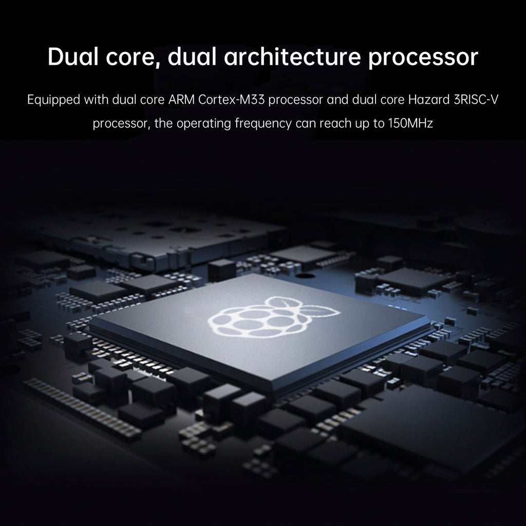 Unieke dual-core, dual-architectuur, uitgerust met een dual-core ARM Cortex-M33-processor en een dual-core Hazard 3 RISC-V-processor, met een kloksnelheid tot 150 MHz