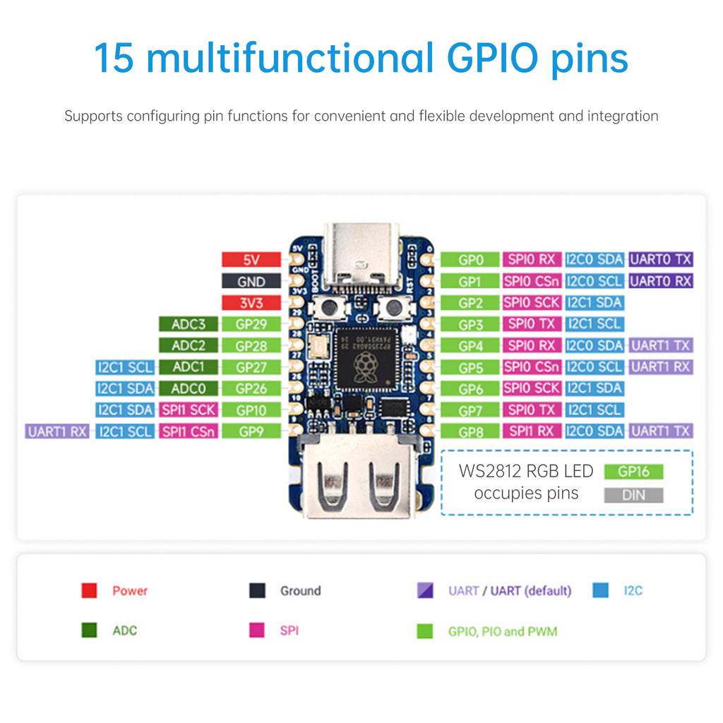 De 15 GPIO-pinnen van de RP2350A worden naar voren gehaald
