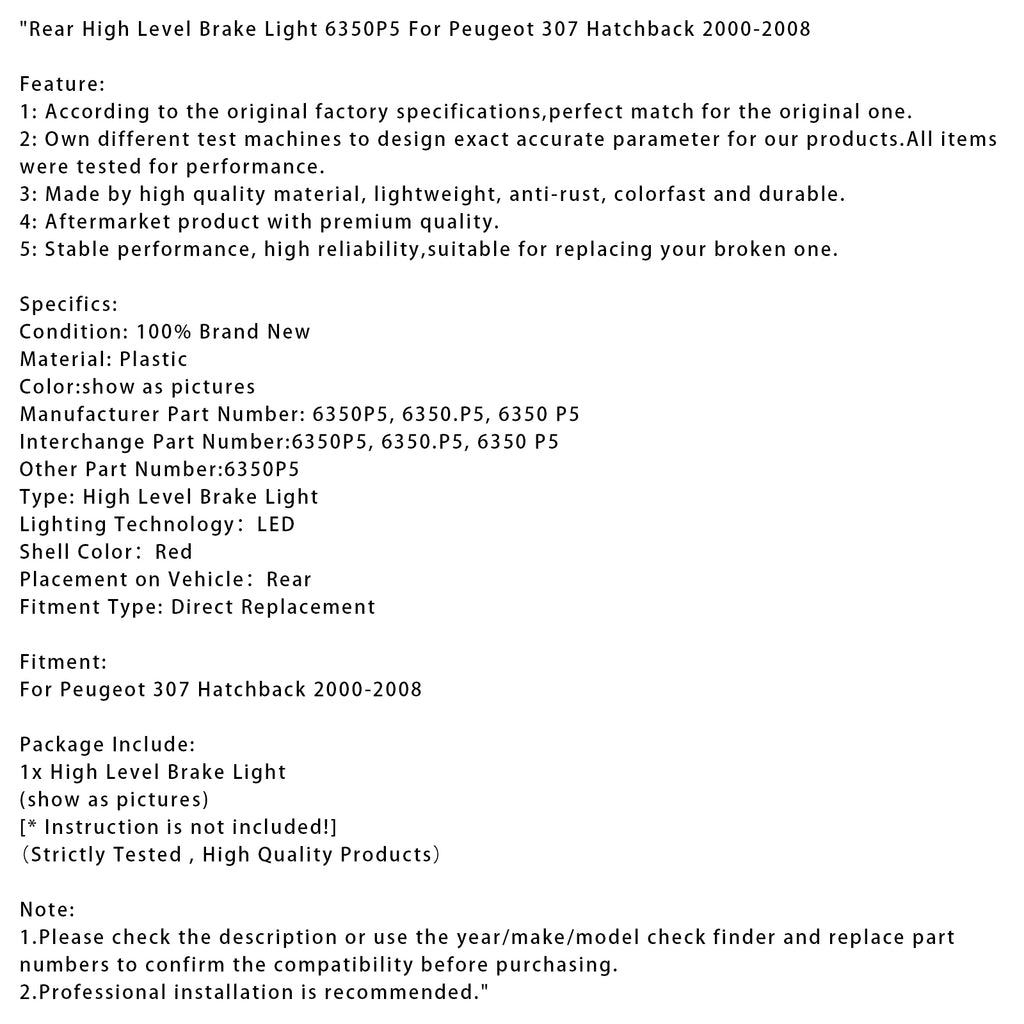 Rear High Level Brake Light 6350P5 For Peugeot 307 Hatchback 2000-2008
