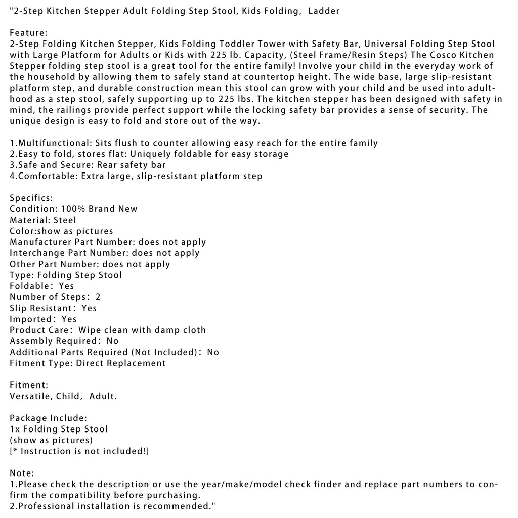 2-traps opvouwbare keukenstepper, opvouwbare peutertoren met veiligheidsbeugel, universele opvouwbare opstap met groot platform voor volwassenen of kinderen met een draagvermogen van 102 kg (stalen frame/kunststof treden). De Cosco Kitchen Stepper opvouwbare opstap is een geweldig hulpmiddel voor het hele gezin! Betrek uw kind bij de dagelijkse huishoudelijke taken door hem of haar veilig op aanrechthoogte te laten staan. Dankzij de brede basis, de grote antislip platformtrede en de duurzame constructie kan deze kruk met uw kind meegroeien en tot in de volwassenheid als opstapje worden gebruikt, met een veilige ondersteuning tot 102 kg. De keukenstepper is ontworpen met het oog op veiligheid; de leuningen bieden perfecte ondersteuning, terwijl de vergrendelbare veiligheidsbeugel een gevoel van veiligheid geeft. Het unieke ontwerp is gemakkelijk op te vouwen en op te bergen.