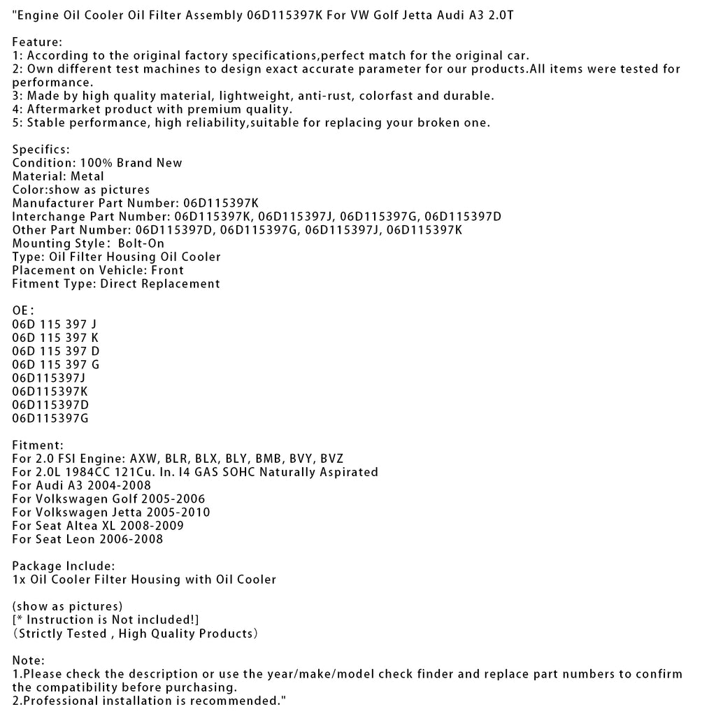 Oliefilter motoroliekoeler 06D115397K voor VW Golf Jetta Audi A3 2.0T