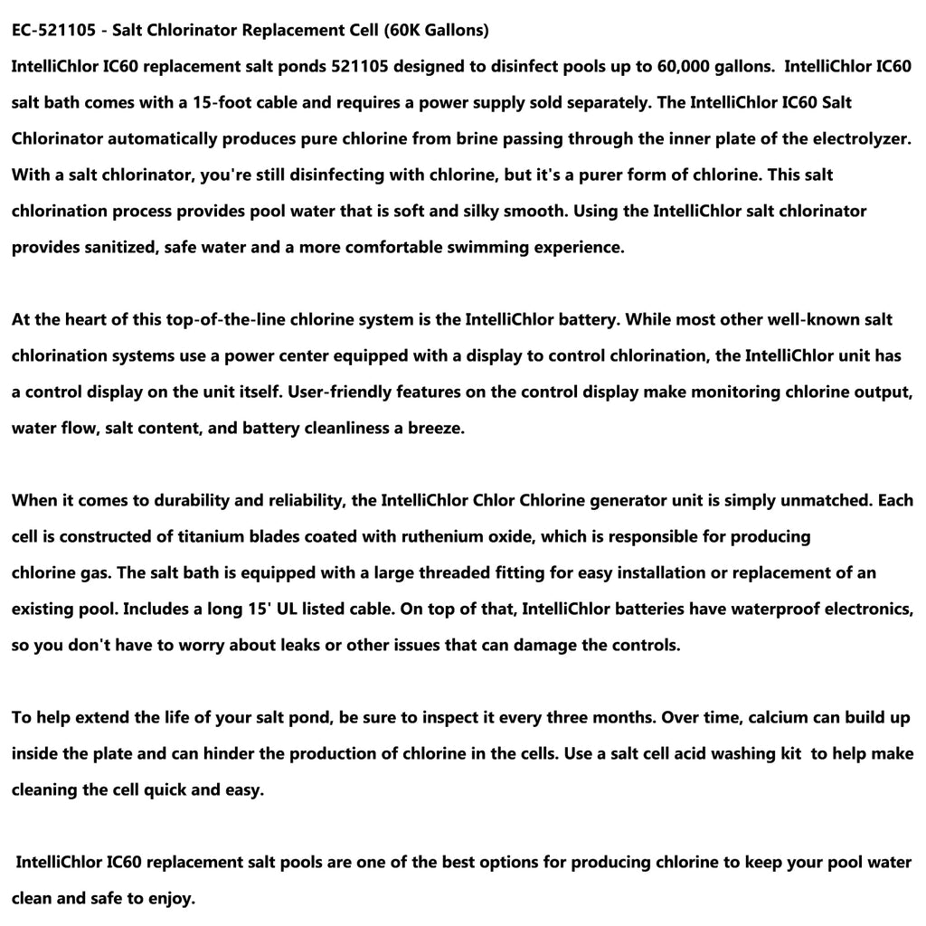 IC60 vervangende zoutvijvers 521105 ontworpen voor het desinfecteren van zwembaden tot 60.000 gallons. Het IC60 zoutbad wordt geleverd met een kabel van 4,5 meter en vereist een apart verkrijgbare voeding. De IC60 zoutchlorinator produceert automatisch zuiver chloor uit pekelwater dat door de binnenplaat van de elektrolyser stroomt. Met een zoutchlorinator desinfecteert u nog steeds met chloor, maar dan een zuiverdere vorm van chloor. Dit zoutchloreringsproces zorgt voor zacht en zijdezacht zwembadwater. Het gebruik van de zoutchlorinator zorgt voor ontsmet, veilig water en een comfortabelere zwemervaring.
