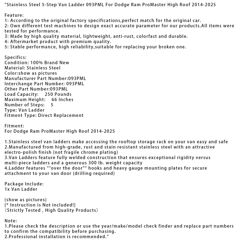 Stainless Steel 5-Step Van Ladder 093PML Fit For Dodge Ram ProMaster High Roof 2014-2025