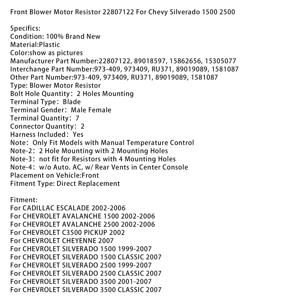 Weerstand van de voorste blowermotor 22807122 voor Chevy Silverado 1500 2500