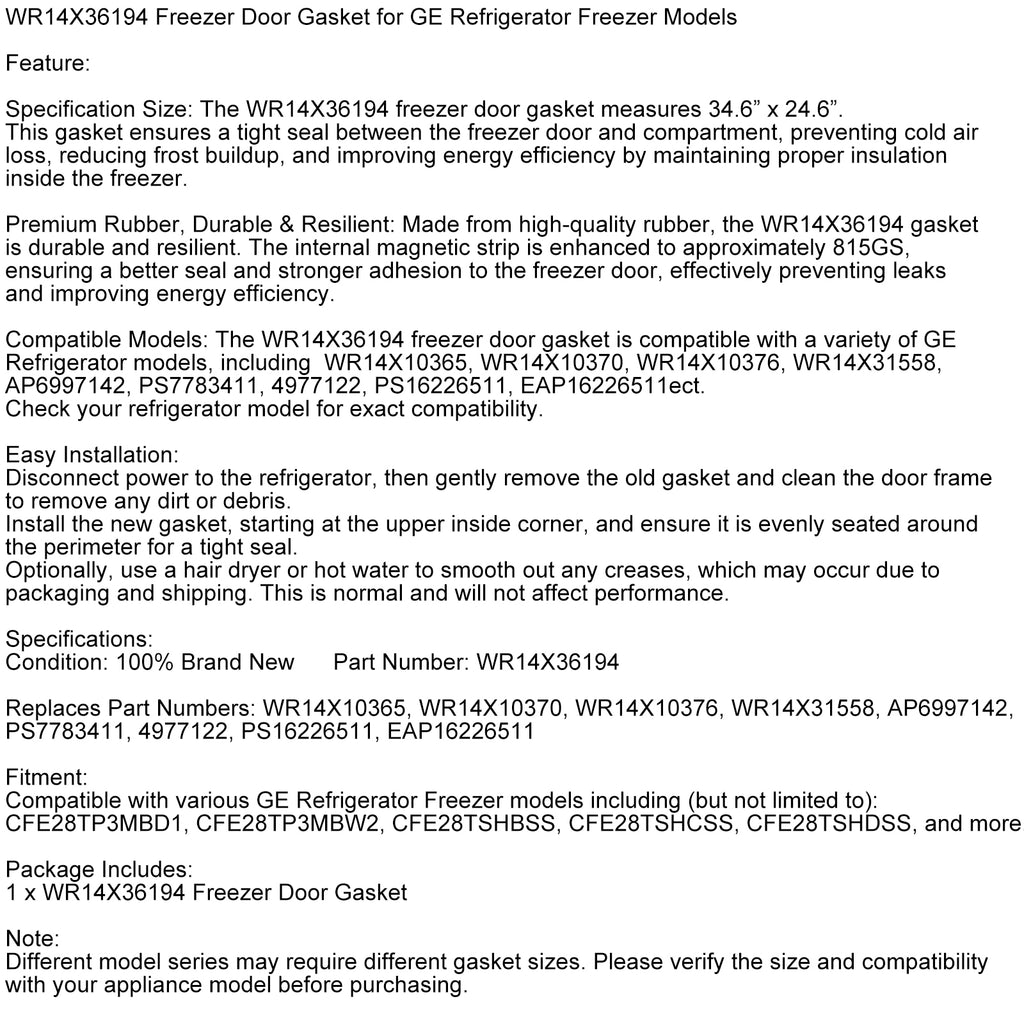 Compatible Models: The WR14X36194 freezer door gasket is compatible with a variety of GE Refrigerator models, including WR14X10365, WR14X10370, WR14X10376, WR14X31558, AP6997142, PS7783411, 4977122, PS16226511, EAP16226511ect.Check your refrigerator model for exact compatibility.