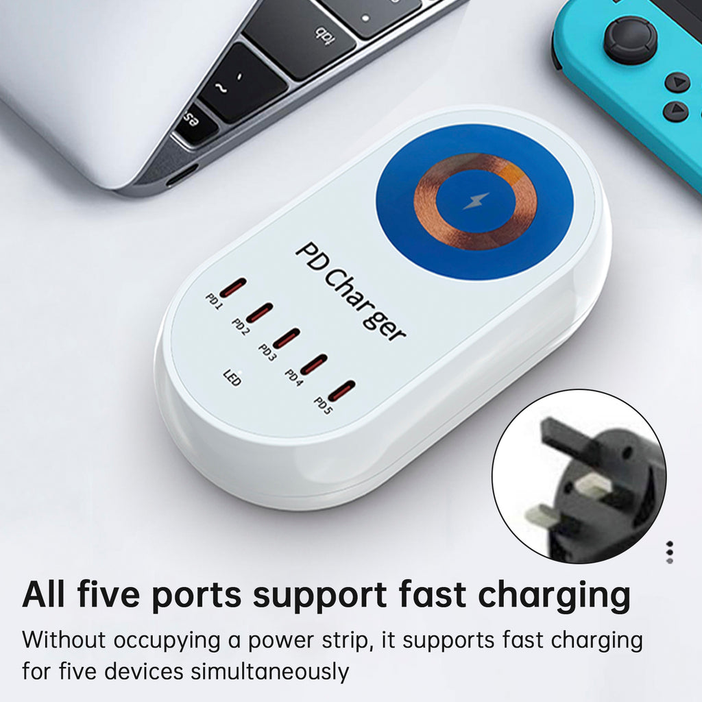 14. Kompatibel med forskjellige enheter, fem PD-porter + én trådløs lader kompatibel med forskjellige enheter, kan lade forskjellige enheter, mobiltelefoner, nettbrett, bærbare datamaskiner, Bluetooth-hodesett