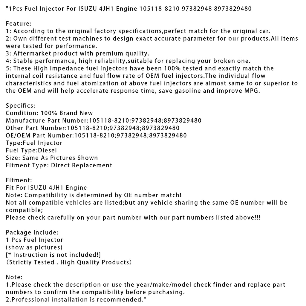 1Pcs Fuel Injector For ISUZU 4JH1 Engine 105118-8210 97382948 8973829480
