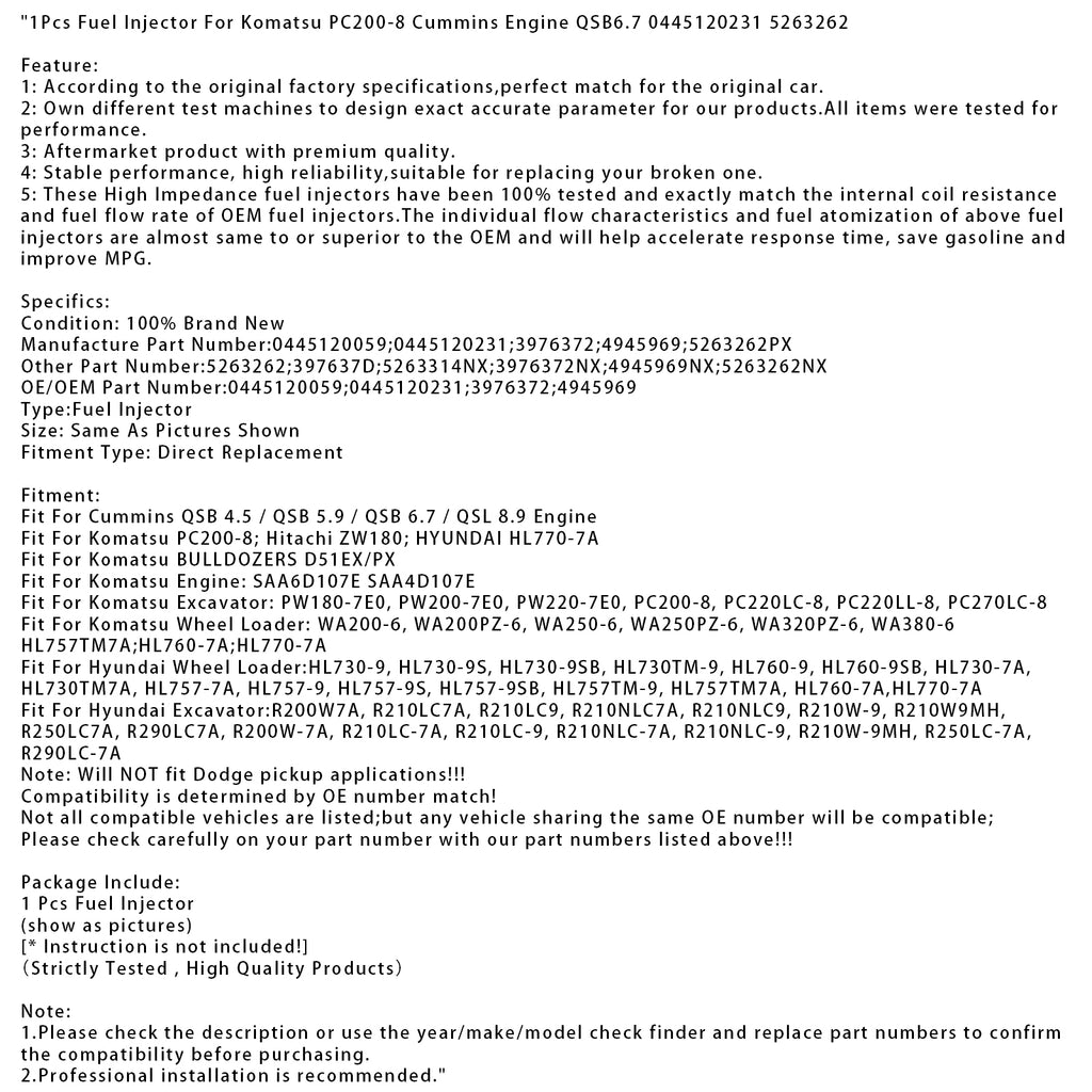 1Pcs Fuel Injector For Komatsu PC200-8 Cummins Engine QSB6.7 0445120231 5263262
