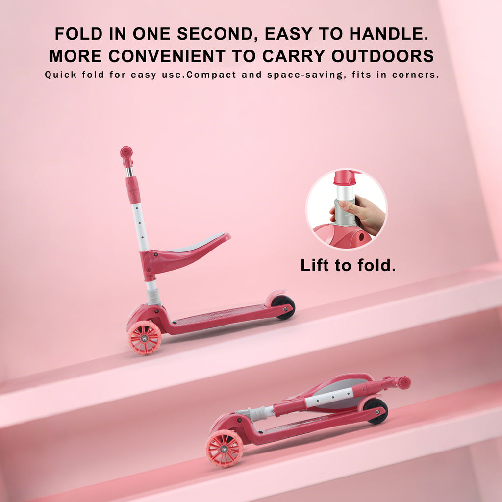 Our 2-in-1 kids scooter is designed to grow with your child, offering both standing and sitting options with an integrated folding seat. With its lean-to-steer technology, LED light-up wheels, and durable construction, it makes riding safe, fun, and stylish. Perfect for both indoor and outdoor play, this scooter is compact, lightweight, and easy to fold for travel or storage.