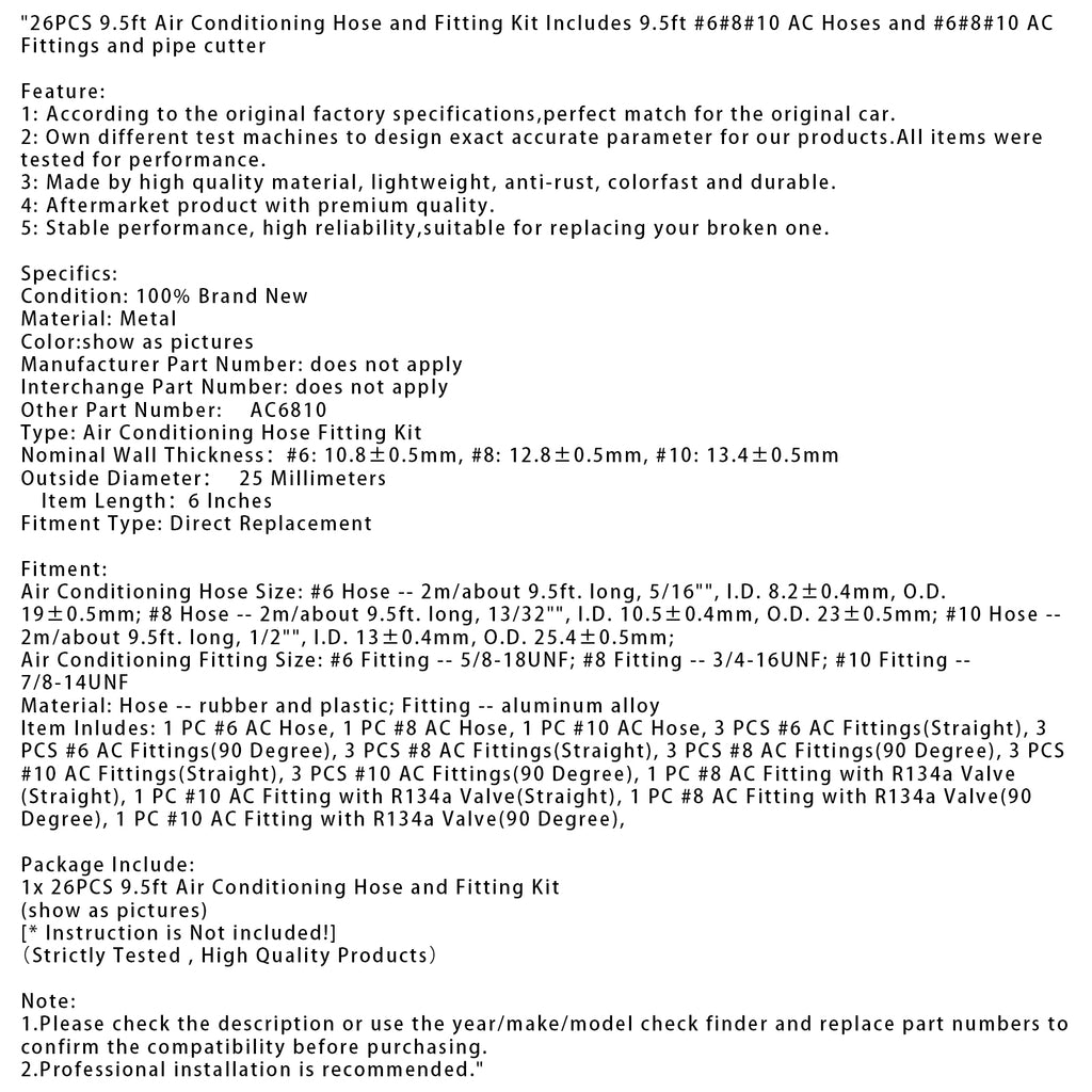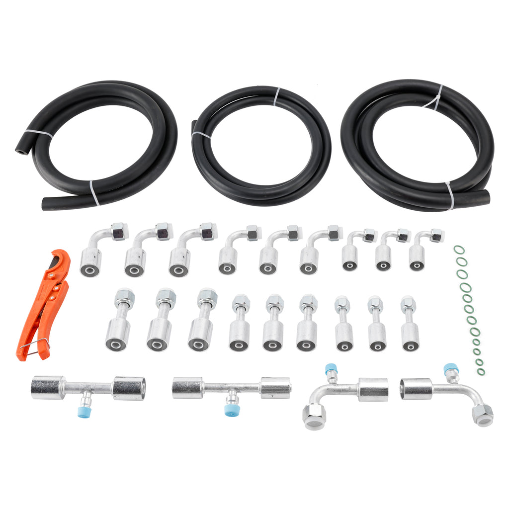 Item Inludes: 1 PC #6 AC Hose, 1 PC #8 AC Hose, 1 PC #10 AC Hose, 3 PCS #6 AC Fittings(Straight), 3 PCS #6 AC Fittings(90 Degree), 3 PCS #8 AC Fittings(Straight), 3 PCS #8 AC Fittings(90 Degree), 3 PCS #10 AC Fittings(Straight), 3 PCS #10 AC Fittings(90 Degree), 1 PC #8 AC Fitting with R134a Valve(Straight), 1 PC #10 AC Fitting with R134a Valve(Straight), 1 PC #8 AC Fitting with R134a Valve(90 Degree), 1 PC #10 AC Fitting with R134a Valve(90 Degree),