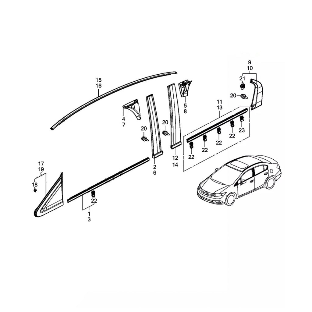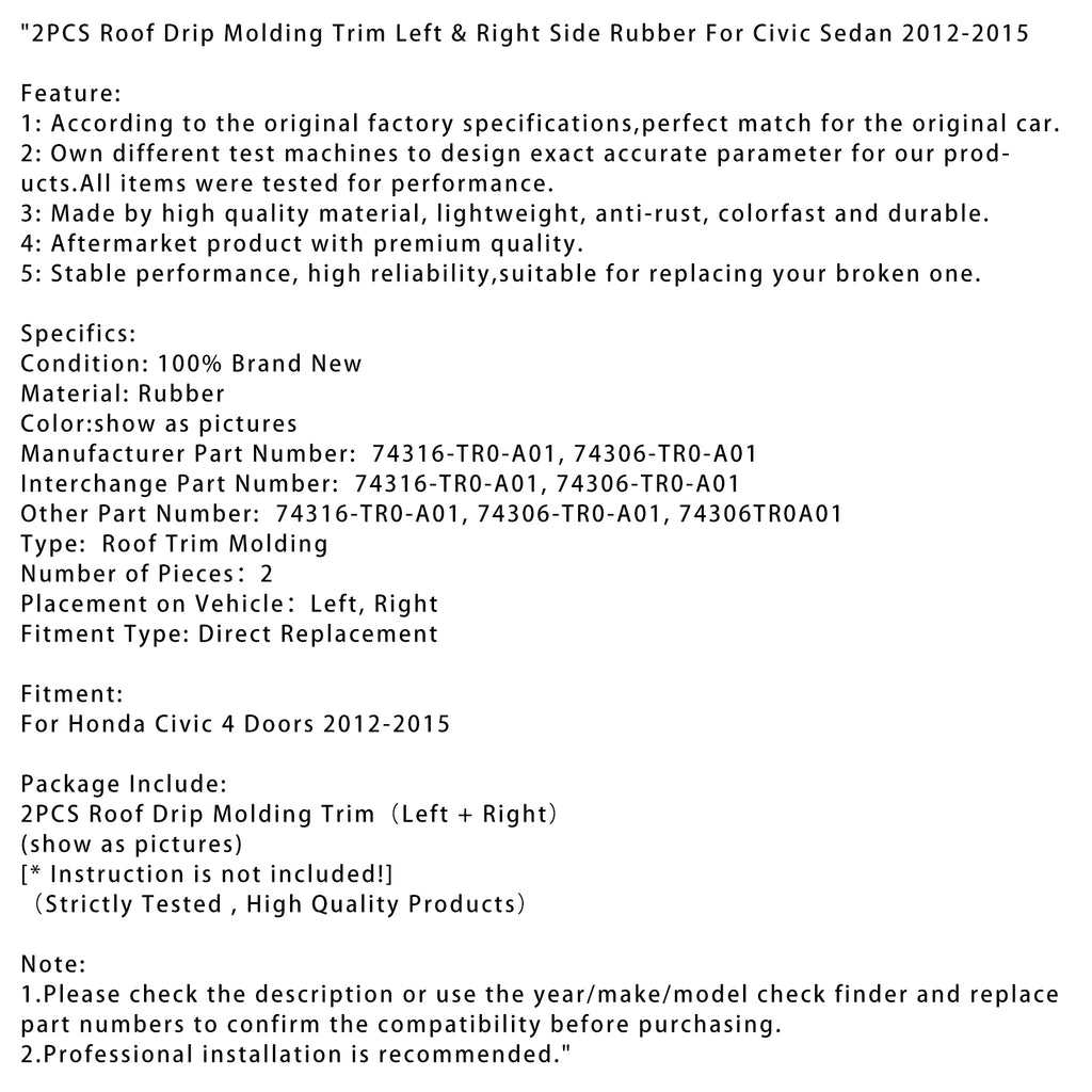 2 stk. takdråpelist venstre && Høyre side gummi for Civic Sedan 2012-2015