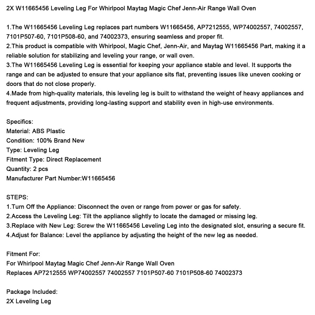2. Dette produktet er kompatibelt med , Magic Chef, Jenn-Air og Maytag W11665456 Delvis, noe som gjør den til en pålitelig løsning for å stabilisere og nivellere komfyren eller veggmontert ovn.