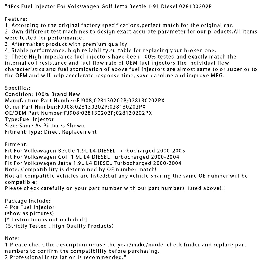 4Pcs Fuel Injector For Volkswagen Golf Jetta Beetle 1.9L Diesel 028130202P