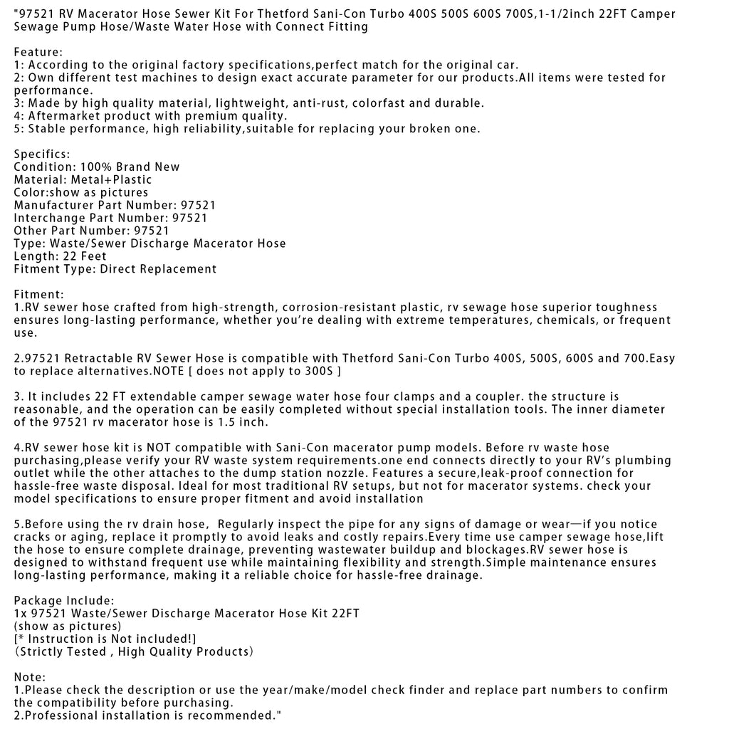 97521 RV Macerator Hose Sewer Kit For Thetford Sani-Con Turbo 400S 500S 600S 700S,1-1/2inch 22FT Camper Sewage Pump Hose/Waste Water Hose with Connect Fitting