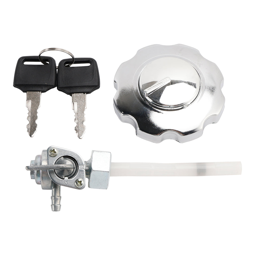 Inkluderer forkrommet bensinlokk med lås, nøkler og en bensinkran for bruk med 3/16" i drivstoffledningen.