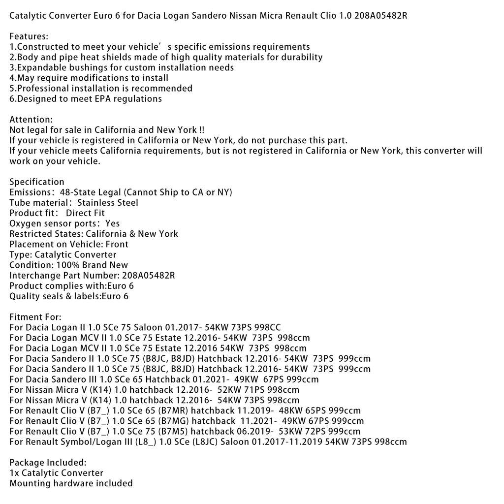 Catalytic Converter Euro 6 for Dacia Logan Sandero Nissan Micra Renault Clio 1.0 208A05482R