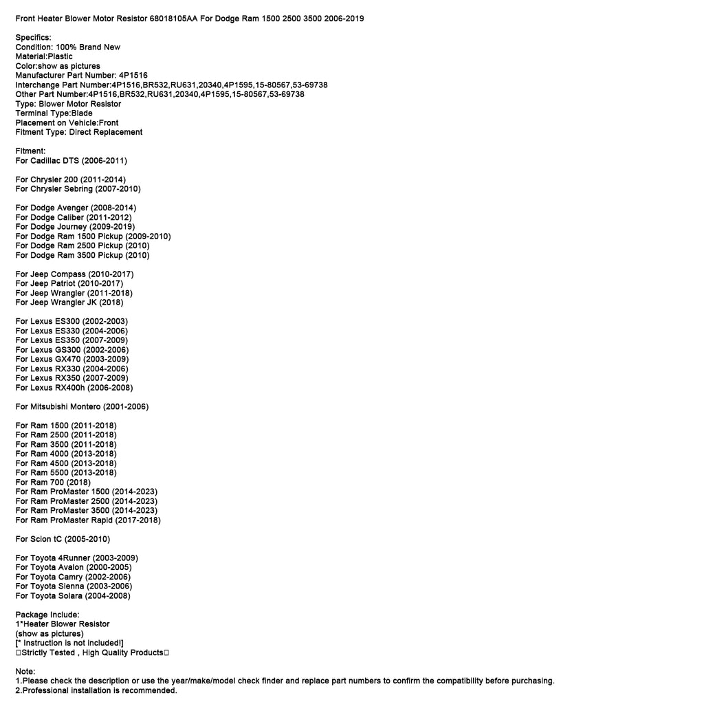 Motstand i fremre varmeviftemotor 68018105AA for Dodge Ram 1500 2500 3500 2006-2019