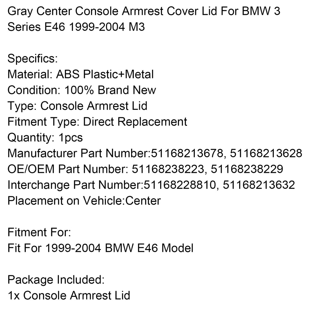 Gray Center Console Armrest Cover Lid For BMW 3 Series E46 1999-2004 M3