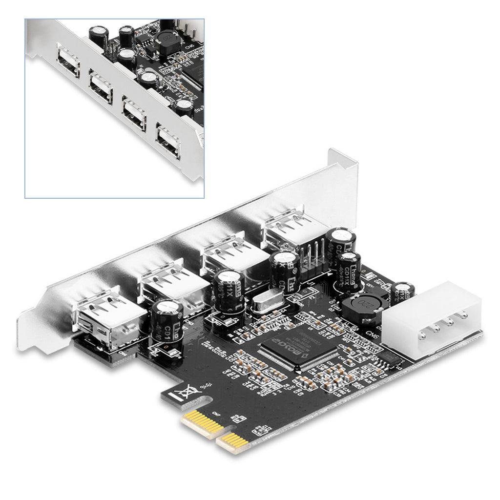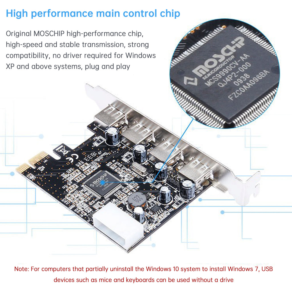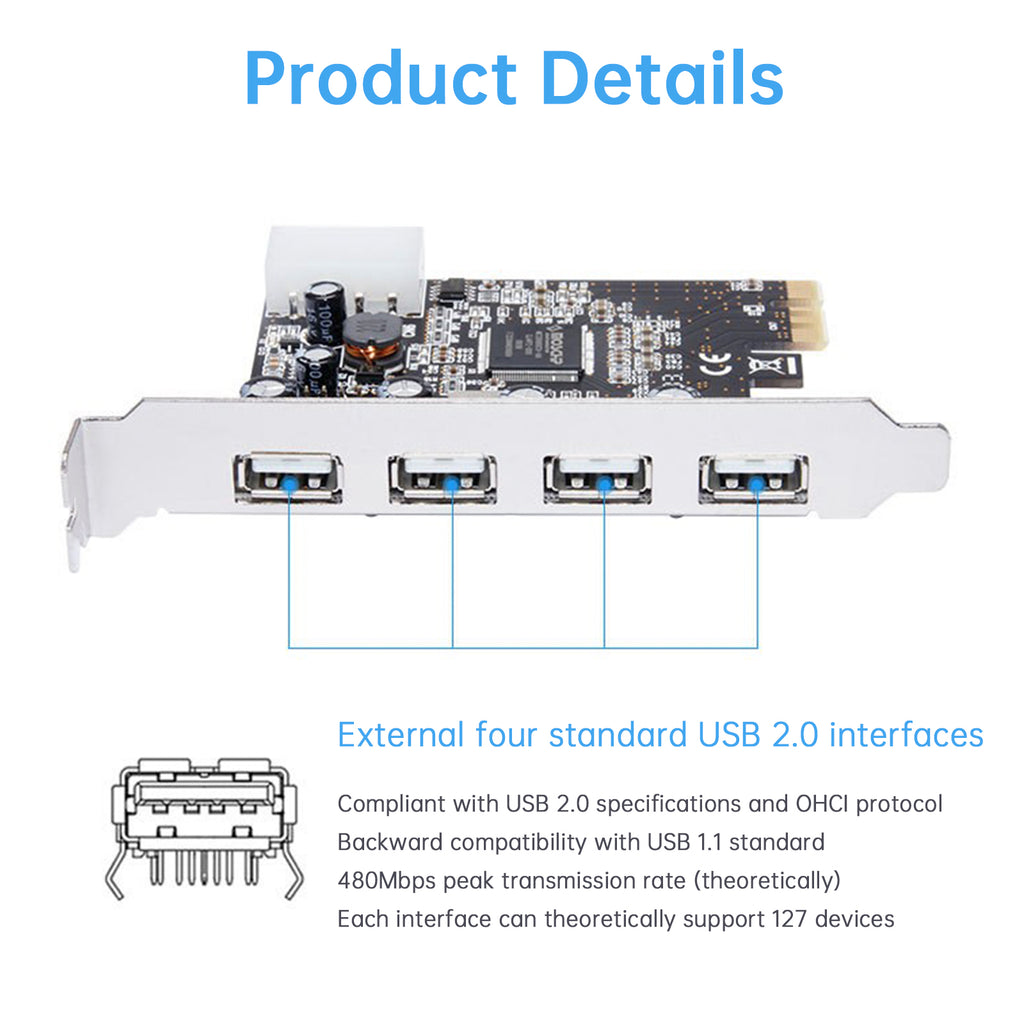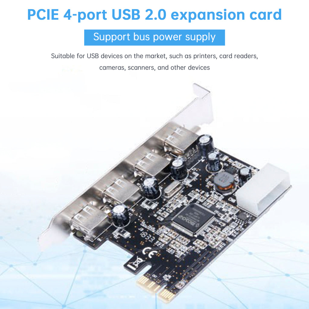 PCIE 4-porters USB 2.0 utvidelseskort. Støtter bussstrømforsyning, egnet for USB-enheter på markedet, for eksempel skrivere, kortlesere, kameraer, skannere og andre enheter.