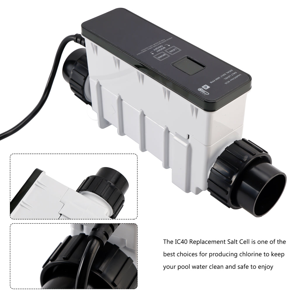 IC40 saltklorinator genererer automatisk rent klor fra saltvannet som passerer gjennom platene inne i cellen. Med en saltklorinator desinfiserer du fortsatt med klor, men det er en renere form for klor. Denne prosessen med saltklorering gir et mykt og silkemykt svømmebassengvann. Bruk av saltklorinator gir desinfisert, trygt vann og en mer komfortabel svømmeopplevelse.