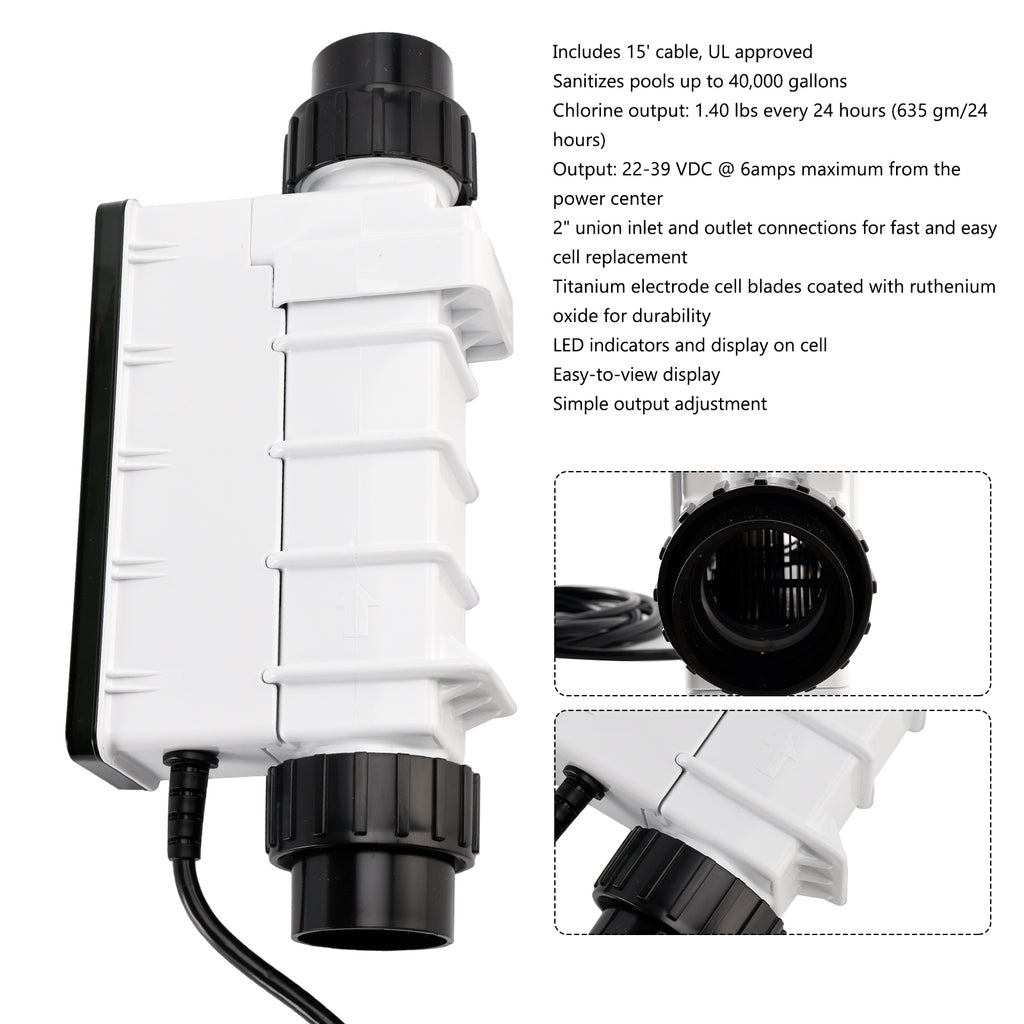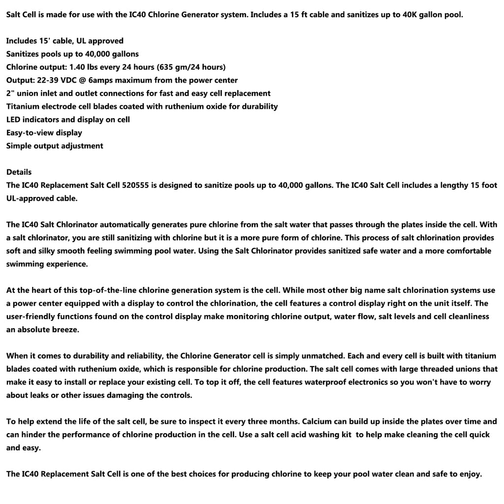 Saltcellen er laget for bruk med IC40-klorgeneratorsystemet. Inkluderer en 15 fot lang kabel og desinfiserer et basseng på opptil 40 000 gallon.