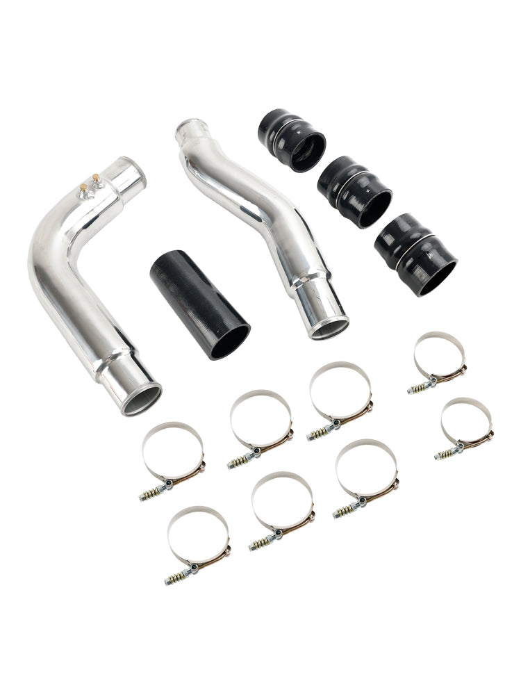 Sølvrør: Konstruert av dornbøyd aluminium med polert overflate. En 100 % CNC-maskinert 6061-aluminiumkobling lar deg beholde lastebilens fabrikkutslippskomponenter og muliggjør rask installasjon.