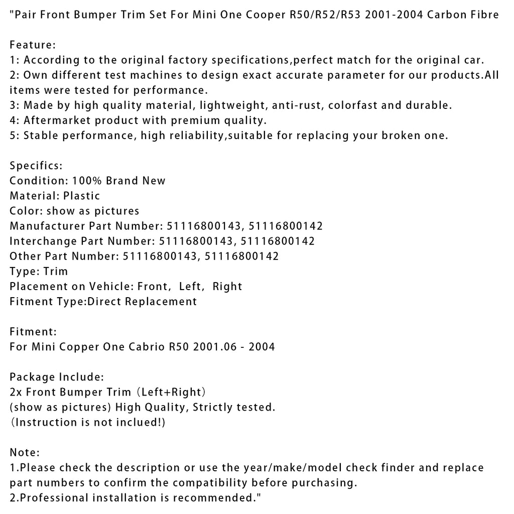 Pair Front Bumper Trim Set For Mini One Cooper R50/R52/R53 2001-2004 Carbon Fibre