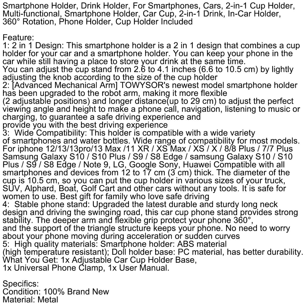 Smarttelefonholder, Drikkeholder, For smarttelefoner, Biler, 2-i-1 koppholder, Multifunksjonell, Smarttelefonholder, Bilkopp, 2-i-1 drikkeholder, Bilholder, 360° rotasjon, Telefonholder, Koppholder inkludert