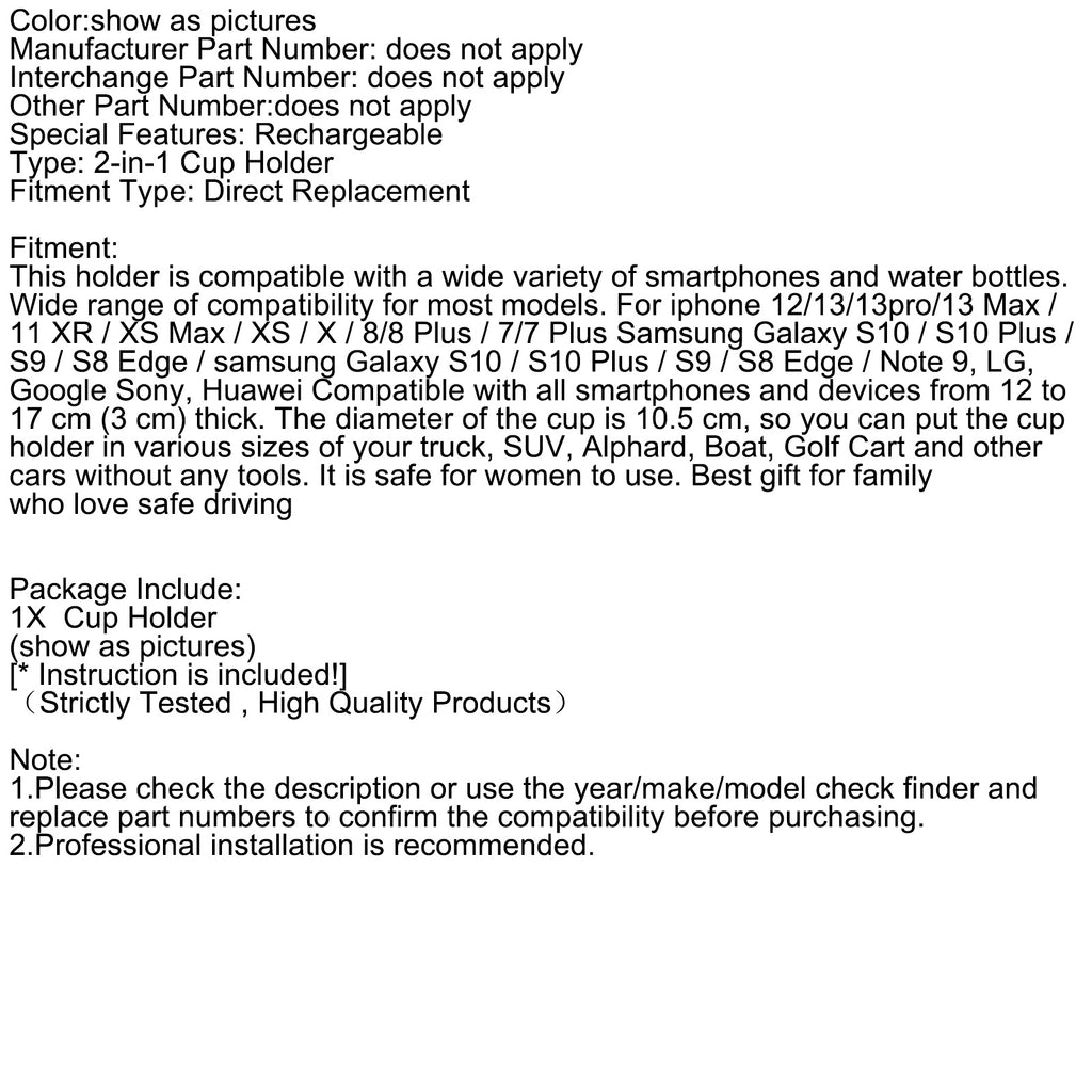 Denne holderen er kompatibel med et bredt utvalg av smarttelefoner og vannflasker. Bredt kompatibilitetsområde for de fleste modeller. For iPhone 12/13/13pro/13 Max /11 XR/XS Max/XS/X/8/8 Plus/7/7 Plus Samsung Galaxy S10/S10 Plus/S9/S8 Edge/Samsung Galaxy S10/S10 Plus/S9/S8 Edge/Note 9, LG, Google Sony, Huawei Kompatibel med alle smarttelefoner og enheter fra 12 til 17 cm (3 cm) tykke. Koppens diameter er 10,5 cm, slik at du kan plassere koppholderen i forskjellige størrelser på lastebilen, SUV-en, Alphard, båten, golfbilen og andre biler uten verktøy. Den er trygg for kvinner å bruke. Den beste gaven til familier som elsker trygg kjøring.