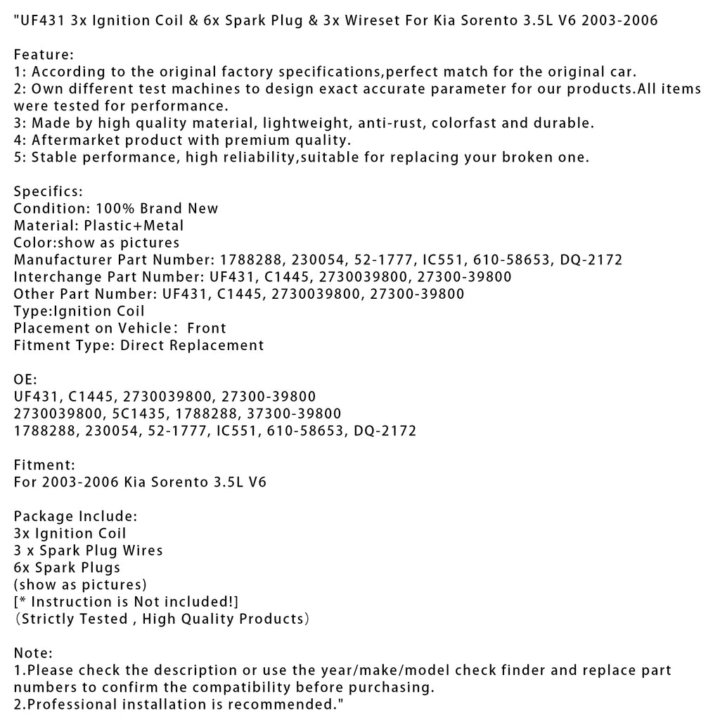 UF431 3x tenningsspole &6x tennplugg &forsterker; 3x ledningssett for Kia Sorento 3,5L V6 2003-2006