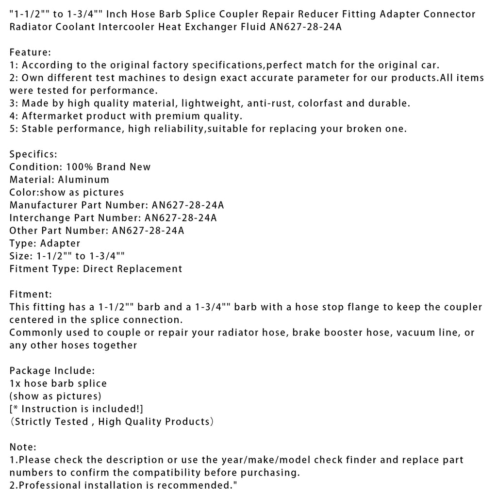 1-1/2" to 1-3/4" Inch Hose Barb Splice Coupler Repair Reducer Fitting Adapter Connector Radiator Coolant Intercooler Heat Exchanger Fluid AN627-28-24A