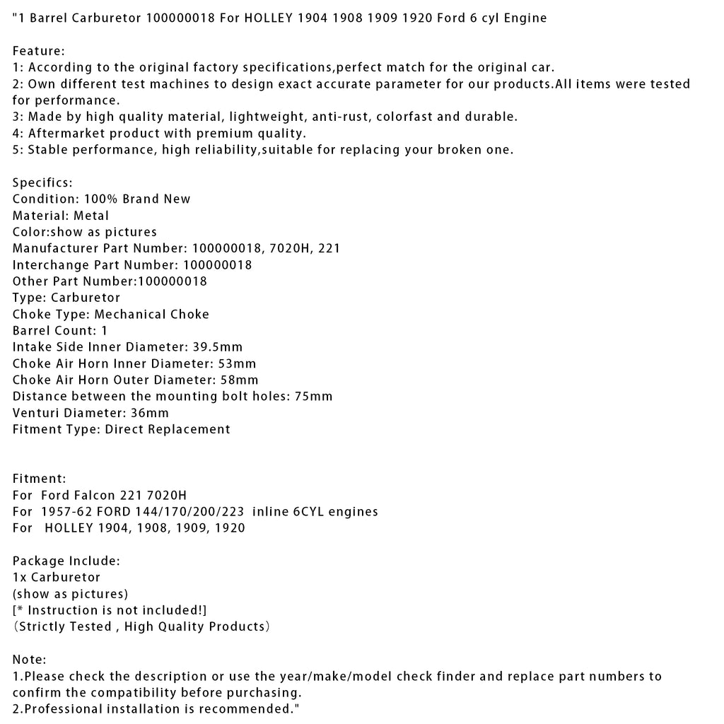 1 Barrel Carburetor 100000018 For HOLLEY 1904 1908 1909 1920 Ford 6 cyl Engine