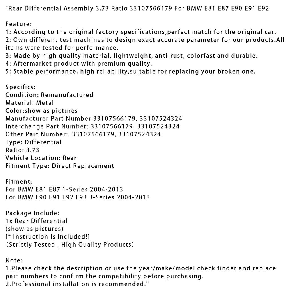 Rear Differential Assembly 3.73 Ratio 33107566179 Fit For BMW E81 E87 E90 E91 E92
