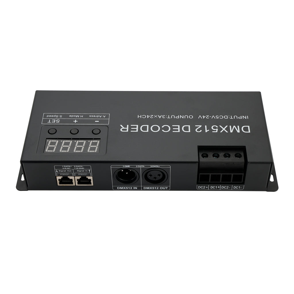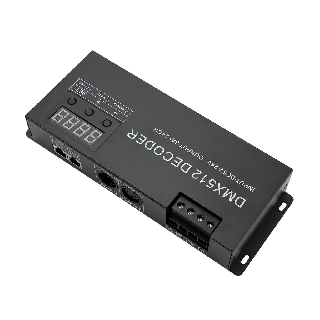 This DMX512 decoder adopts the advanced micro control unit, It can receive the DMX-512 standard digital control signal which is internationally widely used. It changes the signal into PWM control signal to actuate the LED lamp. It can also connect the DMX digital console to change the light or each dynamic effect. In addition, when the decoder is not connected with the DMX console, it can be used as a synchronous controller. That is to say you can Synchronously control number of decoders and LED lights.