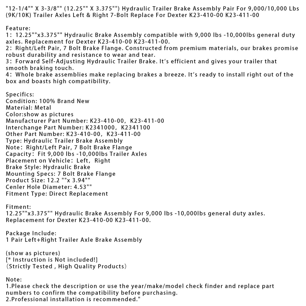 12-1/4" X 3-3/8" (12.25" X 3.375") Hydraulic Trailer Brake Assembly Pair For 9,000/10,000 Lbs (9K/10K) Trailer Axles Left & Right 7-Bolt Replace For Dexter K23-410-00 K23-411-00