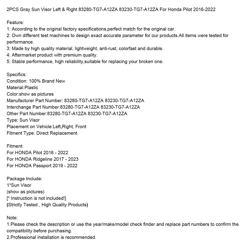 2PCS Gray Sun Visor Left & Right 83280-TG7-A12ZA 83230-TG7-A12ZA For Honda Pilot 2016-2022