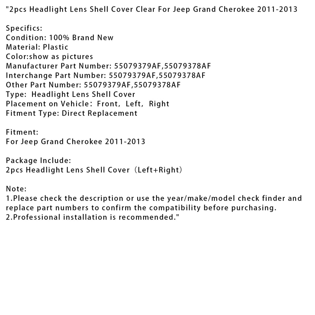 2pcs Headlight Lens Shell Cover Clear For Jeep Grand Cherokee 2011-2013