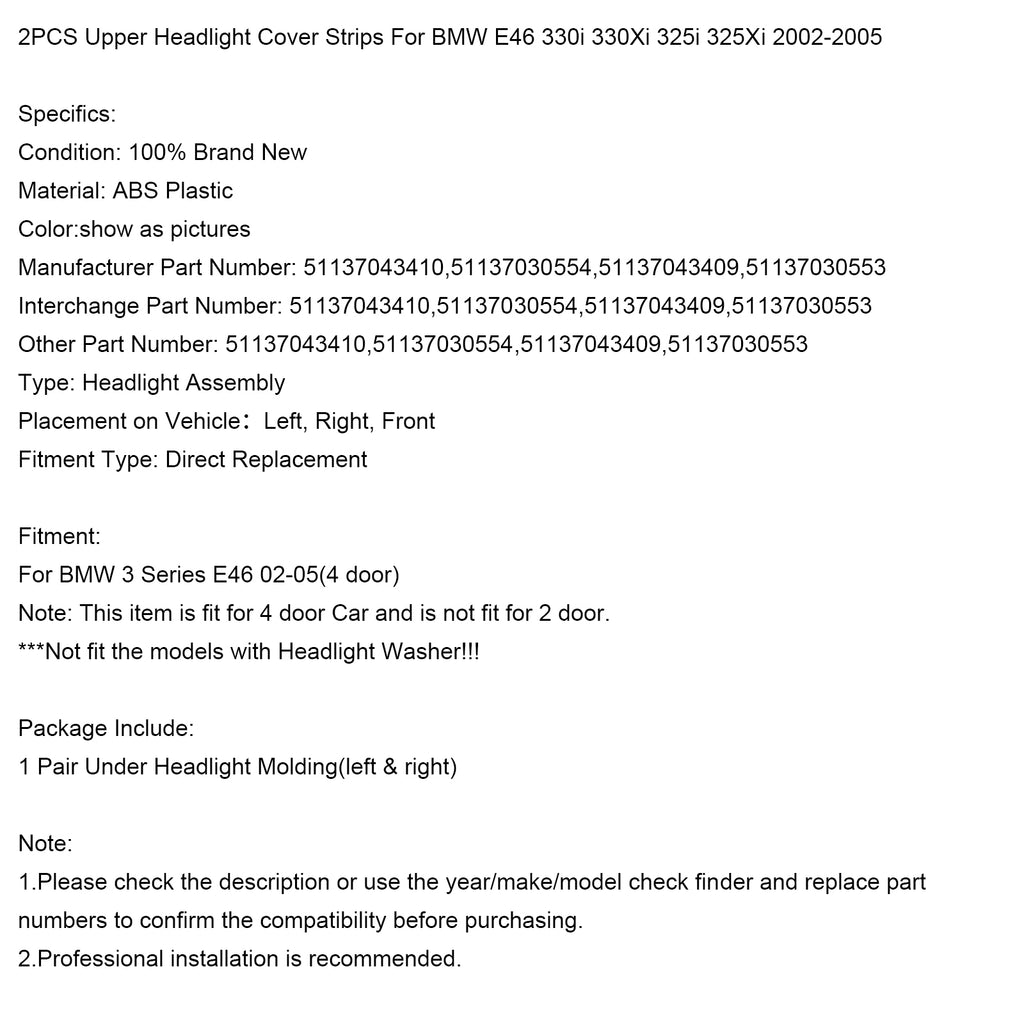 2PCS Upper Headlight Cover Strips For BMW E46 330i 330Xi 325i 325Xi 2002-2005