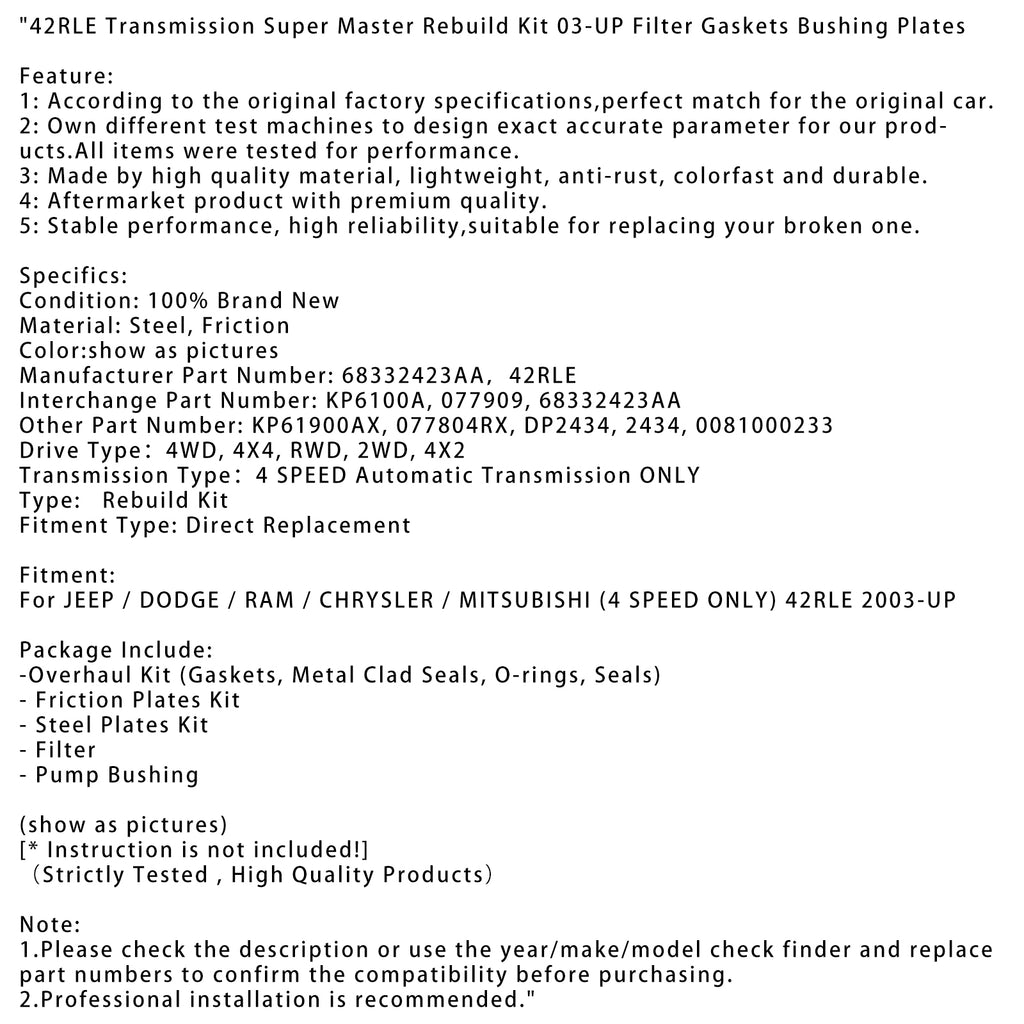 42RLE Transmission Super Master Rebuild Kit 03-UP Filter Gaskets Bushing Plates