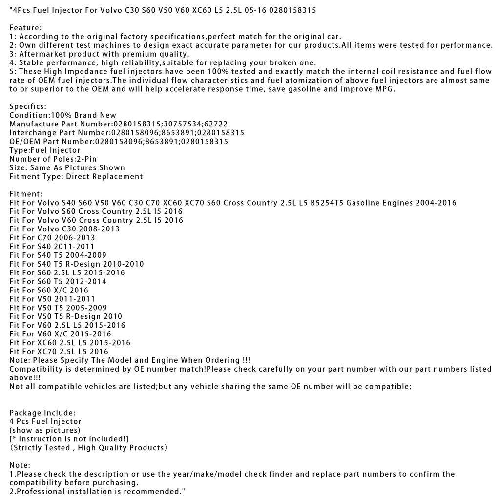 4Pcs Fuel Injector For Volvo C30 S60 V50 V60 XC60 L5 2.5L 05-16 0280158315