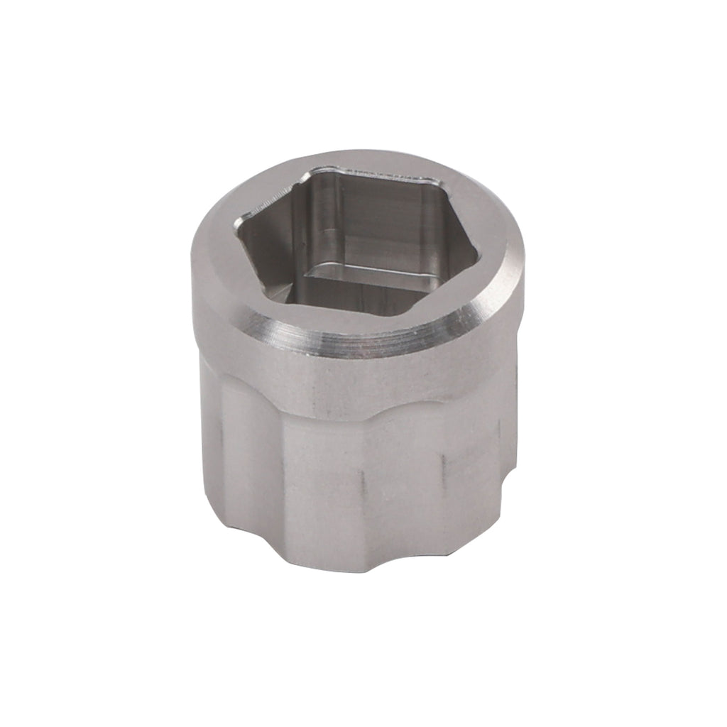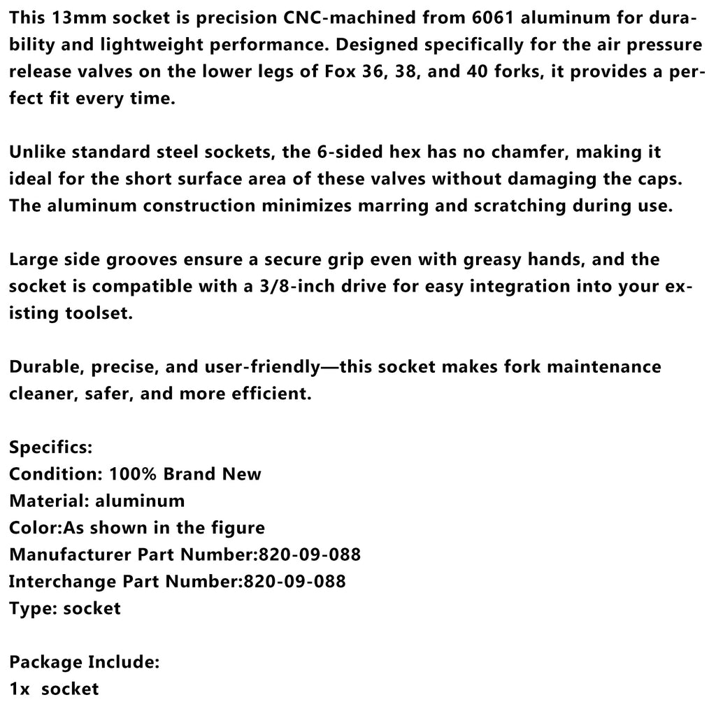 This 13mm socket is precision CNC-machined from 6061 aluminum for durability and lightweight performance. Designed specifically for the air pressure release valves on the lower legs of Fox 36, 38, and 40 forks, it provides a perfect fit every time.