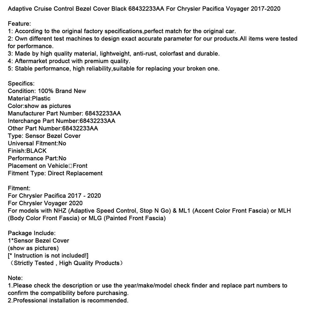 Adaptive Cruise Control Bezel Cover Black 68432233AA For Chrysler Pacifica Voyager 2017-2020