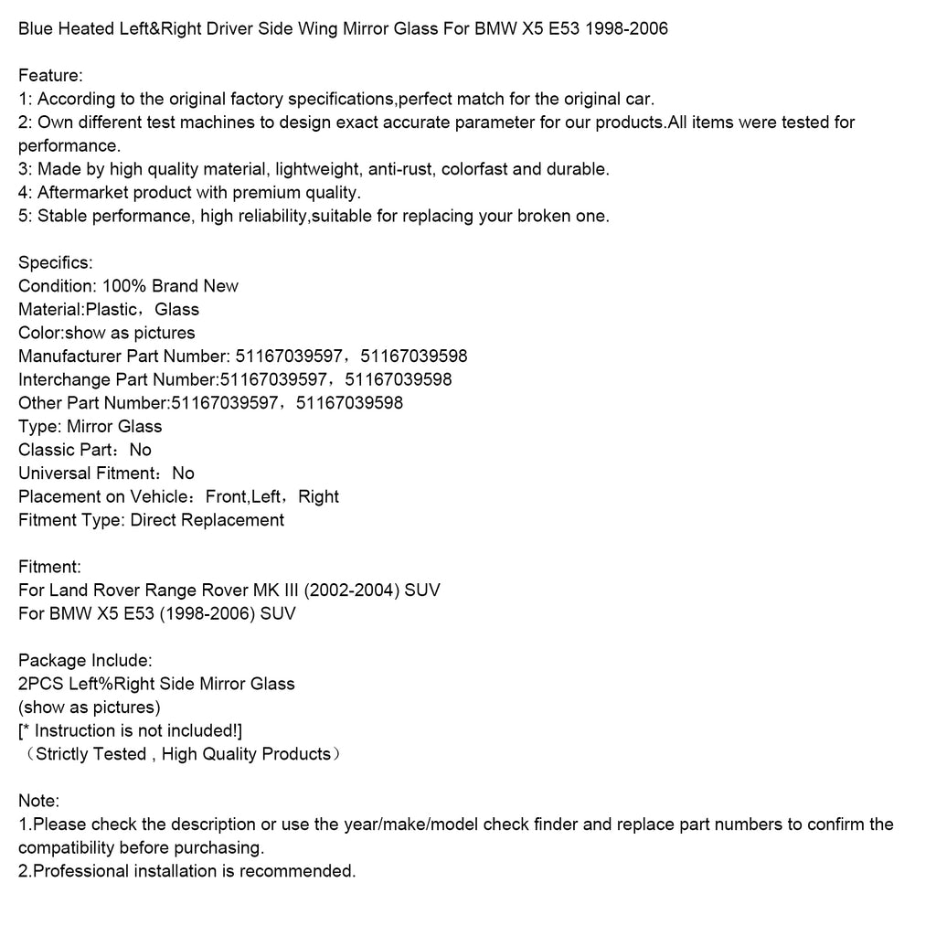 Blue Heated Left&Right Driver Side Wing Mirror Glass For BMW X5 E53 1998-2006