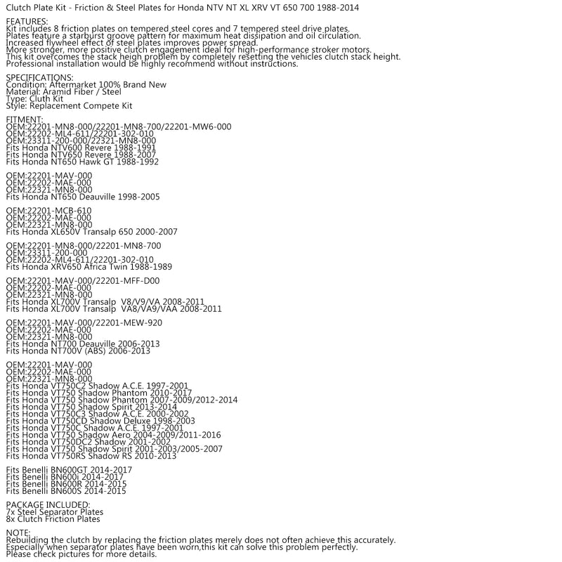1988-2014 Honda NTV NT XL XRV VT 650 700 Clutch Kit Steel & Friction Plates