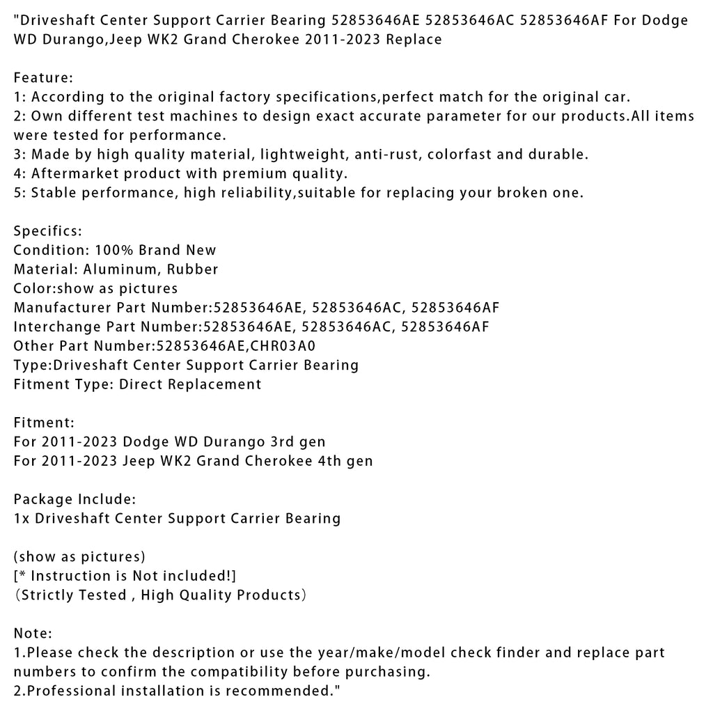 Driveshaft Center Support Carrier Bearing 52853646AE 52853646AC 52853646AF For Dodge WD Durango,Jeep WK2 Grand Cherokee 2011-2023 Replace