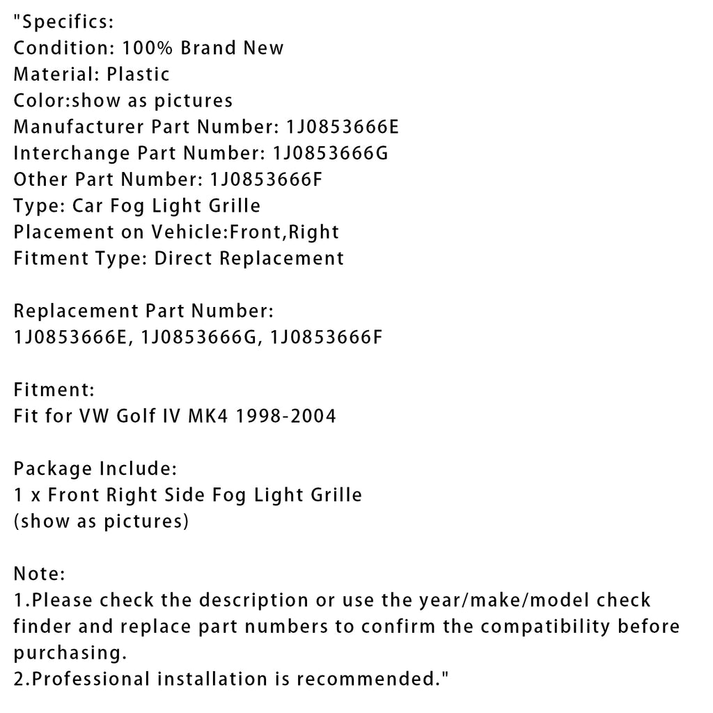 1998-2004 VW Golf IV MK4 Front Right Side Bumper Grille Fog Light Grill 1J0853666E 1J0853666G