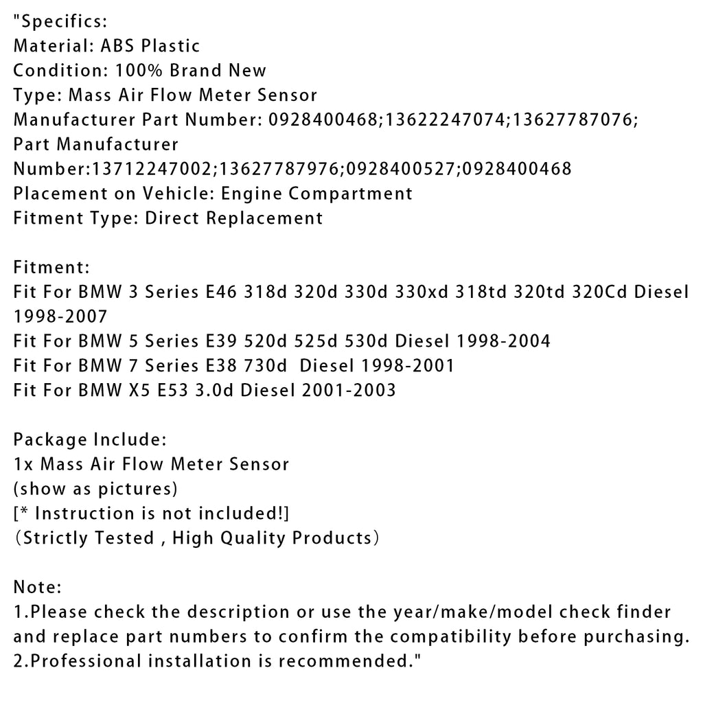 Mass Air Flow Meter Sensor For BMW E38 E39 E46 E53 98-05 0928400468