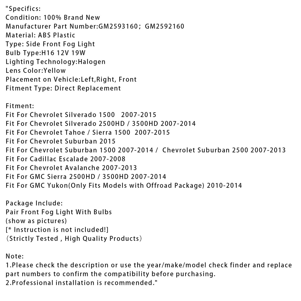 Pair Front Fog Light Lamps With Bulbs For Chevy Silverado 2007-2013 Yellow Lens