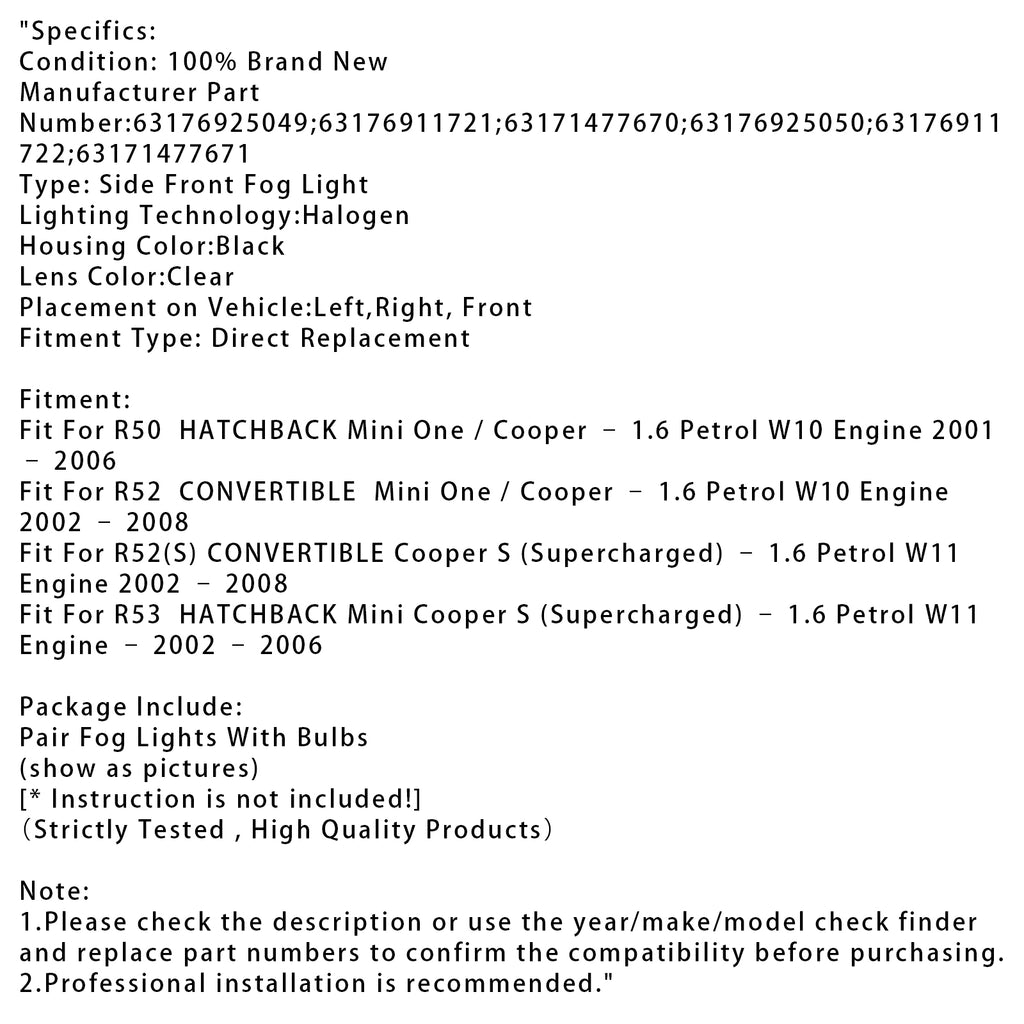Pair Front Bumper Fog Lights For Mini Cooper One R50 R52 R53 63176925050